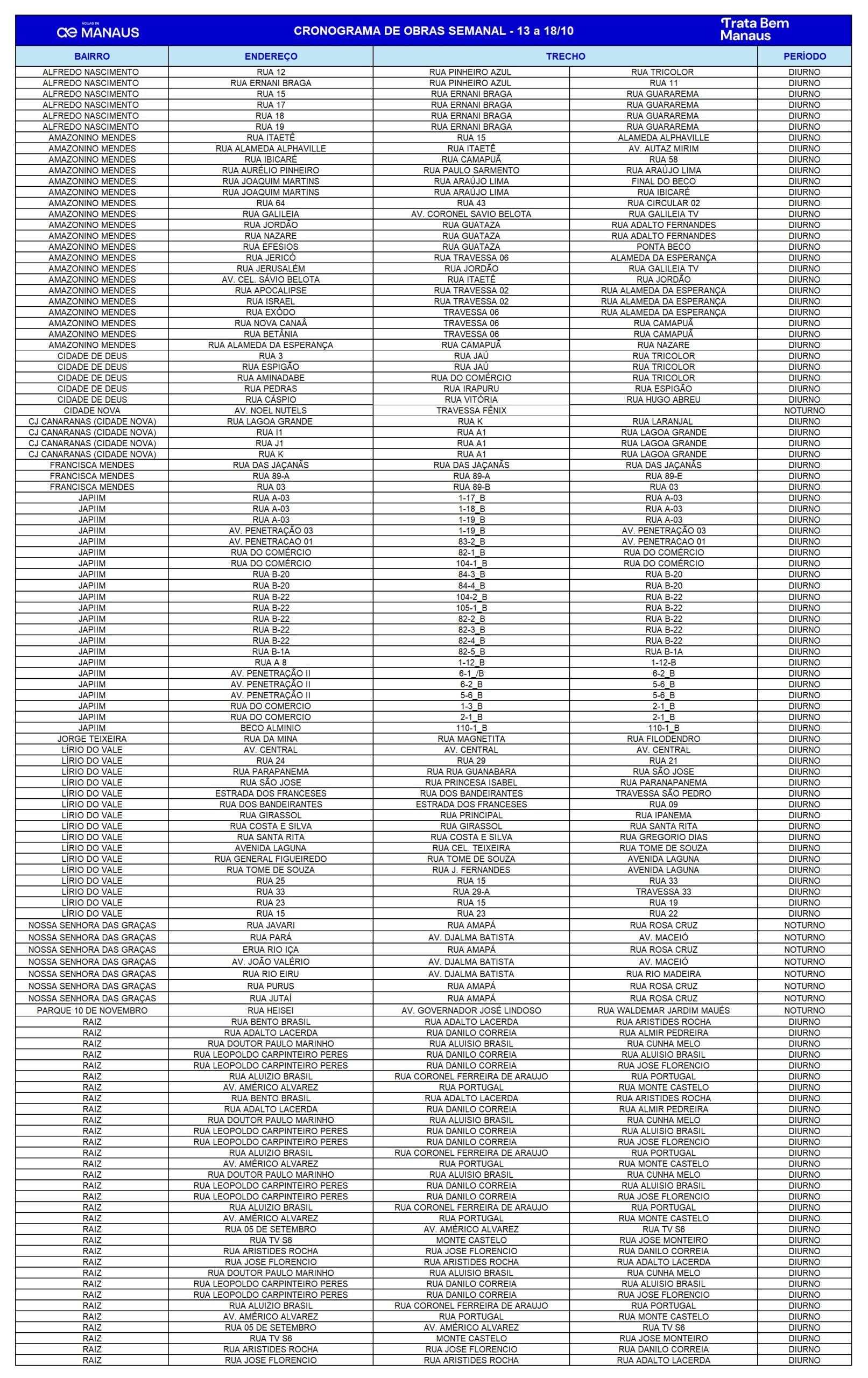 As intervenções fazem parte do programa Trata Bem Manaus, que tem como objetivo universalizar o serviço de esgotamento sanitário na cidade. Os trabalhos são realizados nos turnos diurno e noturno, conforme a movimentação das vias. Durante a execução, todas as ruas são devidamente sinalizadas e, quando necessário, interditadas para garantir a segurança operacional.