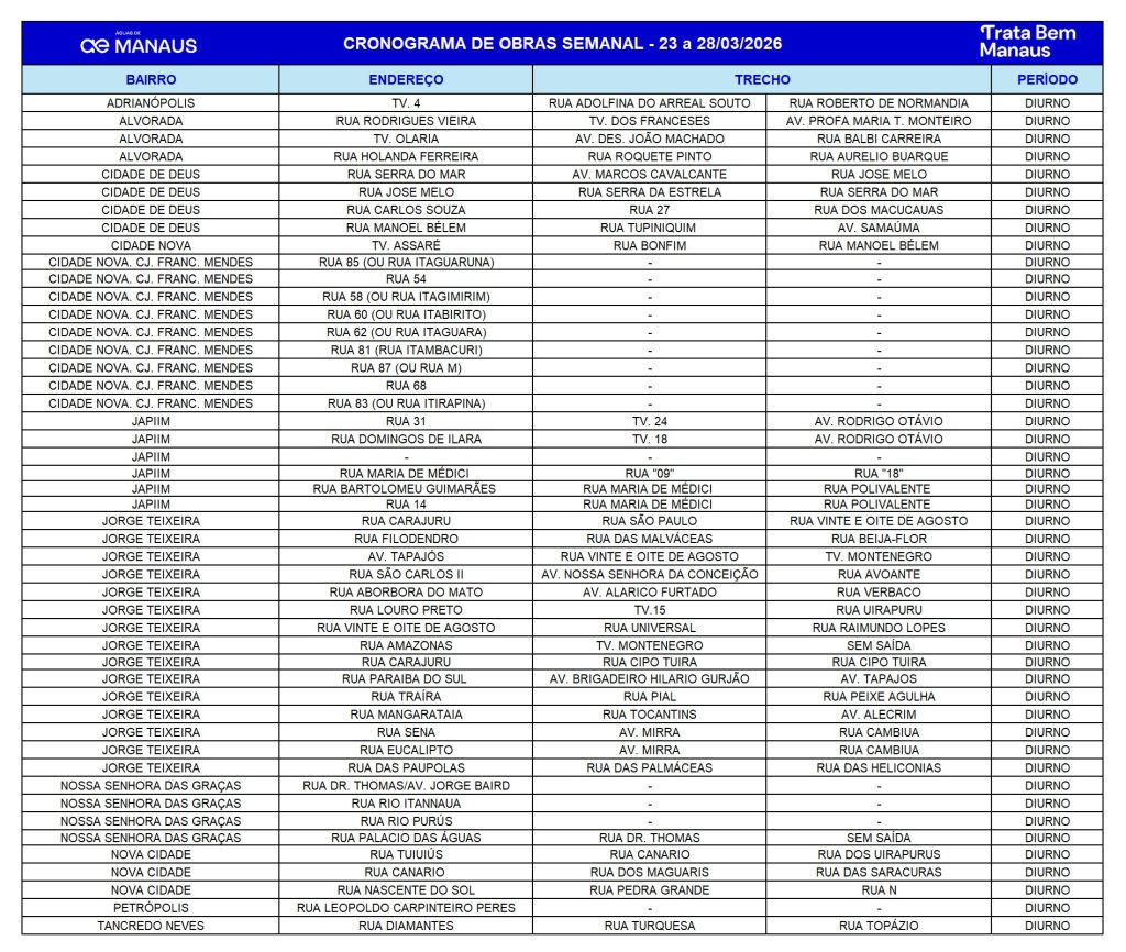 As intervenções ocorrem no período diurno. Na zona Norte, as áreas contempladas são Cidade de Deus, Cidade Nova, conjunto Francisca Mendes e Nova Cidade. Nas zonas Sul e Centro-Sul, os serviços acontecem nos bairros Japiim, Petrópolis, Adrianópolis e Nossa Senhora das Graças. Na zona Leste, as obras são realizadas em vias dos bairros Jorge Teixeira e Tancredo Neves. Já na zona Centro-Oeste, os trabalhos ocorrem no bairro Alvorada.