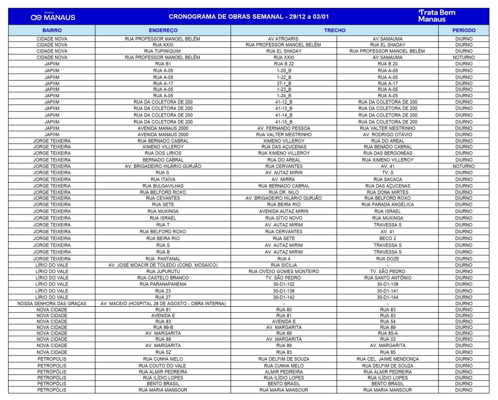 As obras integram o programa Trata Bem Manaus e ocorrem nas zonas Norte, Sul, Centro-Sul, Leste e Centro-Oeste, com atividades realizadas nos turnos diurno e noturno, conforme o fluxo de cada via. No feriado de 1º de janeiro, os serviços serão suspensos, com retomada das atividades na sexta-feira (2).
