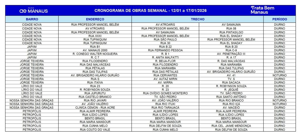 As obras integram o programa Trata Bem Manaus e ocorrem nas zonas Norte, Sul, Centro-Sul, Leste e Centro-Oeste, com atividades realizadas nos turnos diurno e noturno, conforme o fluxo de cada via. No feriado de 1º de janeiro, os serviços serão suspensos, com retomada das atividades na sexta-feira (2).