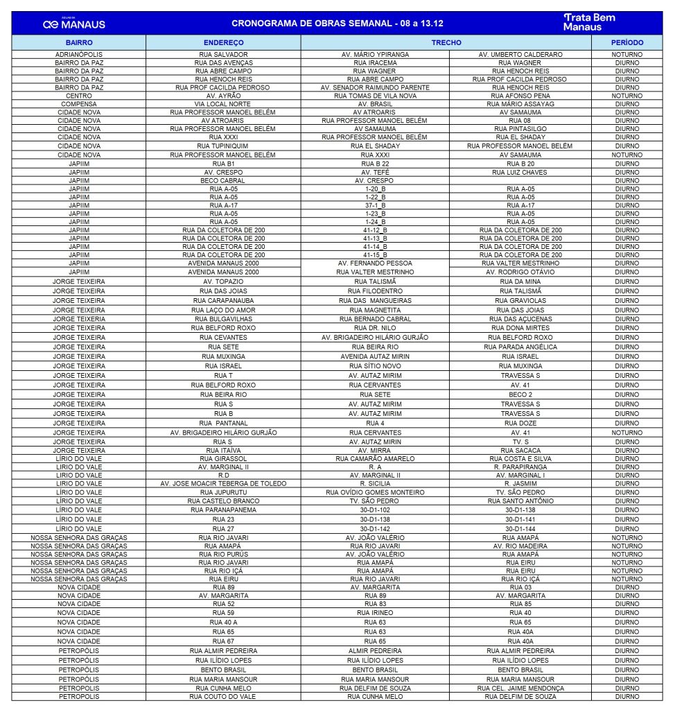 As obras fazem parte do programa Trata Bem Manaus que tem como objetivo a expansão do sistema de esgotamento sanitário da cidade e a universalização no prazo de menos de 10 anos. Durante a execução dos serviços, todas as vias são sinalizadas e interditadas parcialmente.