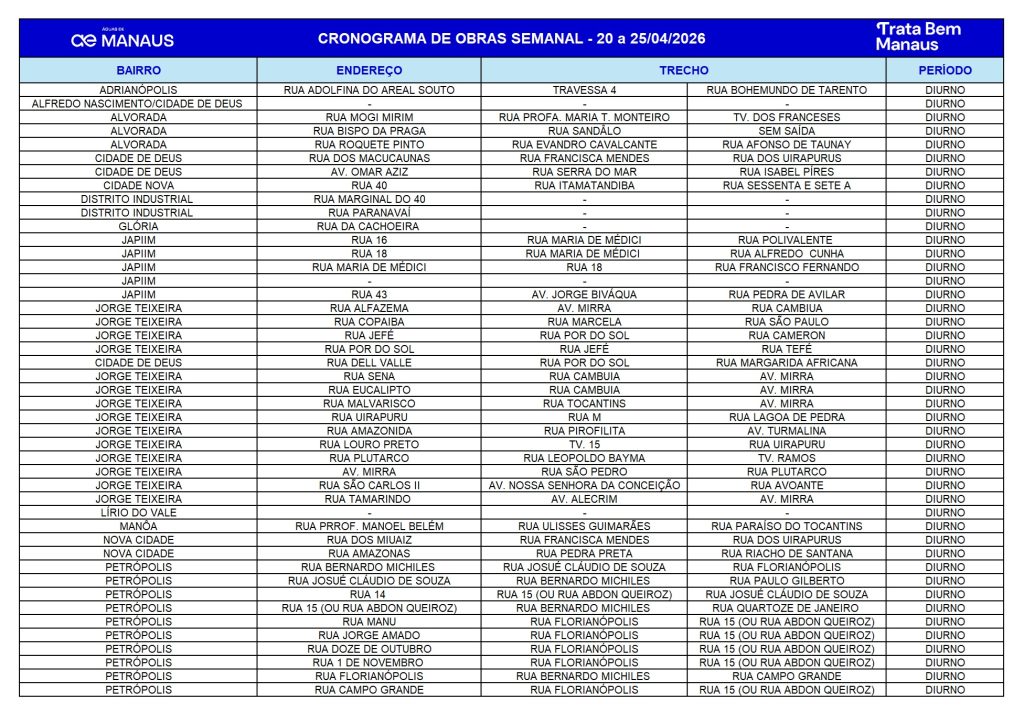 Nesta semana, a concessionária Águas de Manaus executa obras em 13 áreas distribuídas por todas as zonas da capital. Os serviços têm início nesta segunda-feira (20). Em razão do feriado de Tiradentes, não haverá atividades na terça-feira (21). Os trabalhos serão retomados na quarta-feira (22) e seguem até o fim da semana.